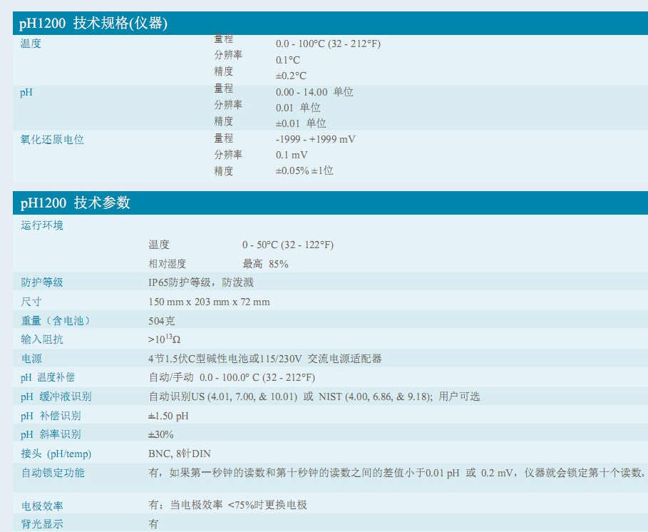 美國YSI 1200 實(shí)驗(yàn)室PH計(jì)技術(shù)參數(shù):